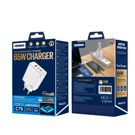 JELLICO Netz-Ladegerät C79 GaN PD 65W 2xUSB-C + 1xUSB QC3.0 + Kabel USB-C - Lightning weiss