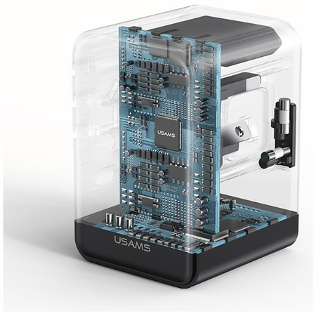 USAMS Travel Adapter oferuje wyjątkową moc i uniwersalność, obsługując różne standardy zasilania. Adapter wyposażony jest w gniazda 2 x USB-A oraz 3 x USB-C, co pozwala na ładowanie wielu urządzeń jednocześnie.