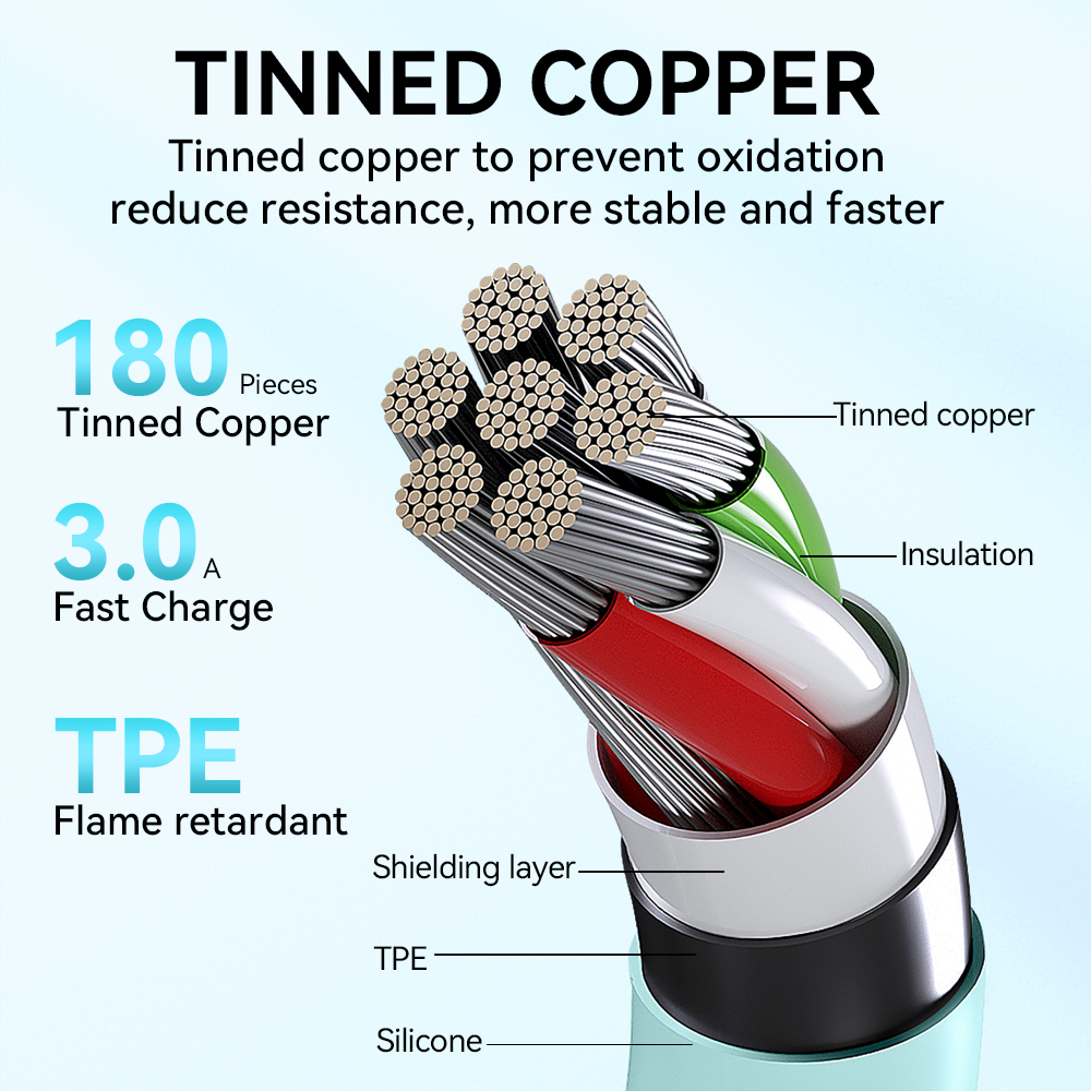 Grube, cynowane rdzenie miedziane zapewniają imponującą zdolność dostarczania prądu, co gwarantuje stabilne i szybkie doświadczenie ładowania bez wzrostu temperatury nawet przy intensywnym ładowaniu.