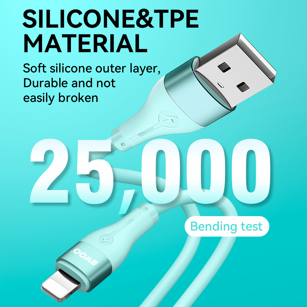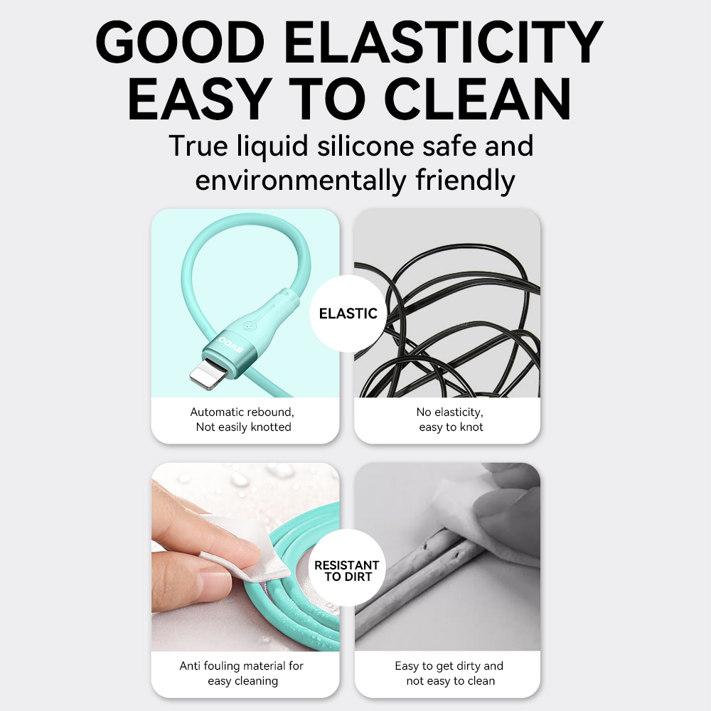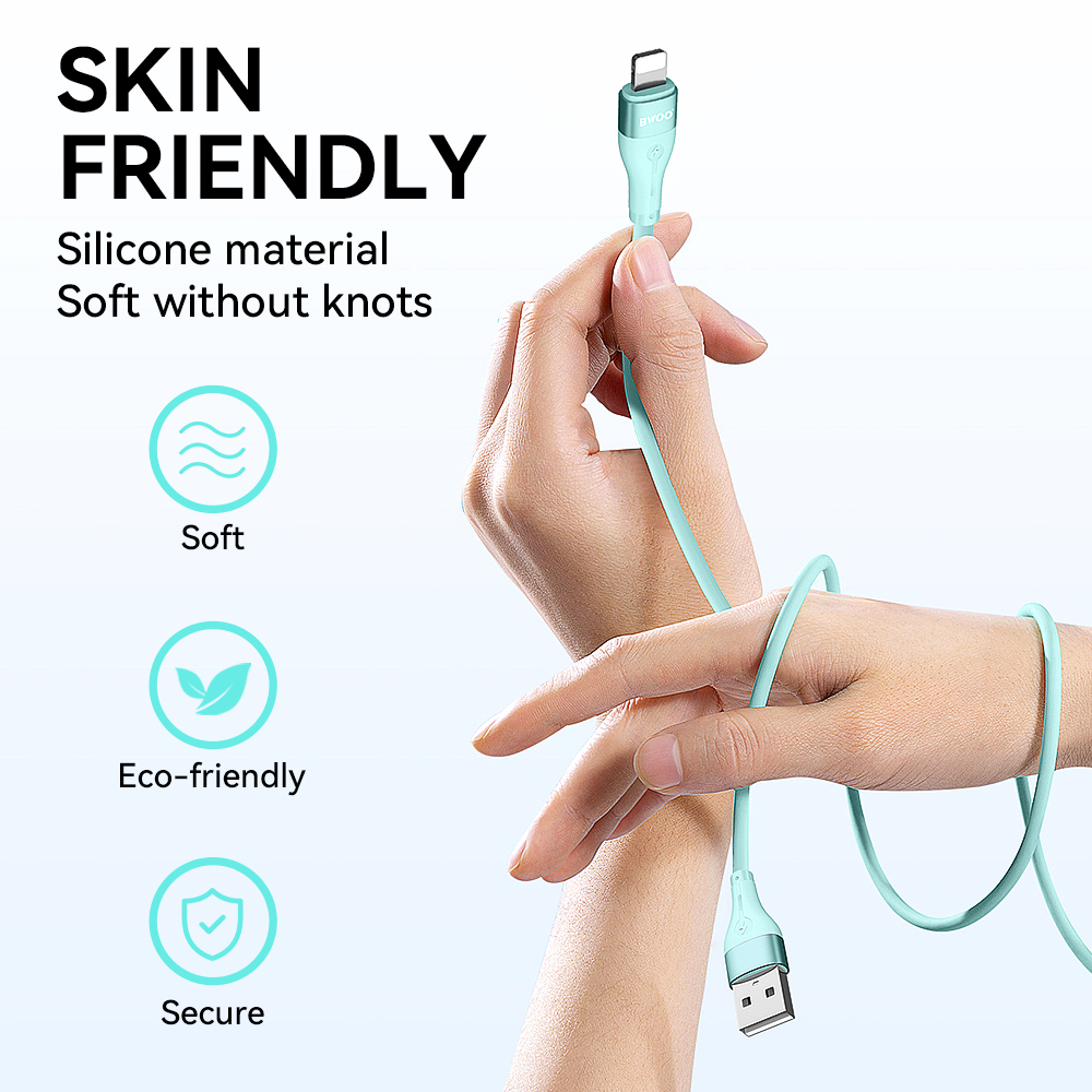 Ten kabel Lightning wykonany jest z materiałów ciekłego silikonu o stopniu spożycia, ekologicznych, które są zaskakująco miękkie i dobrze elastyczne, co nie tylko pozwala na użytkowanie bez plątania i przyjazne dla skóry, ale również zapewnia lepszą odporność na zużycie, aby uniknąć codziennych uszkodzeń.